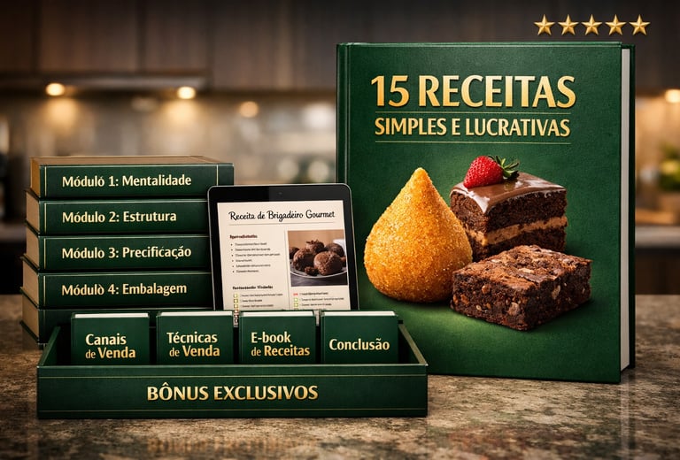 Não é apenas um livro de receitas. É um sistema completo que te ensina a mentalidade certa, a estrutura do negócio, as técnicas de venda e os canais para alcançar seus clientes.